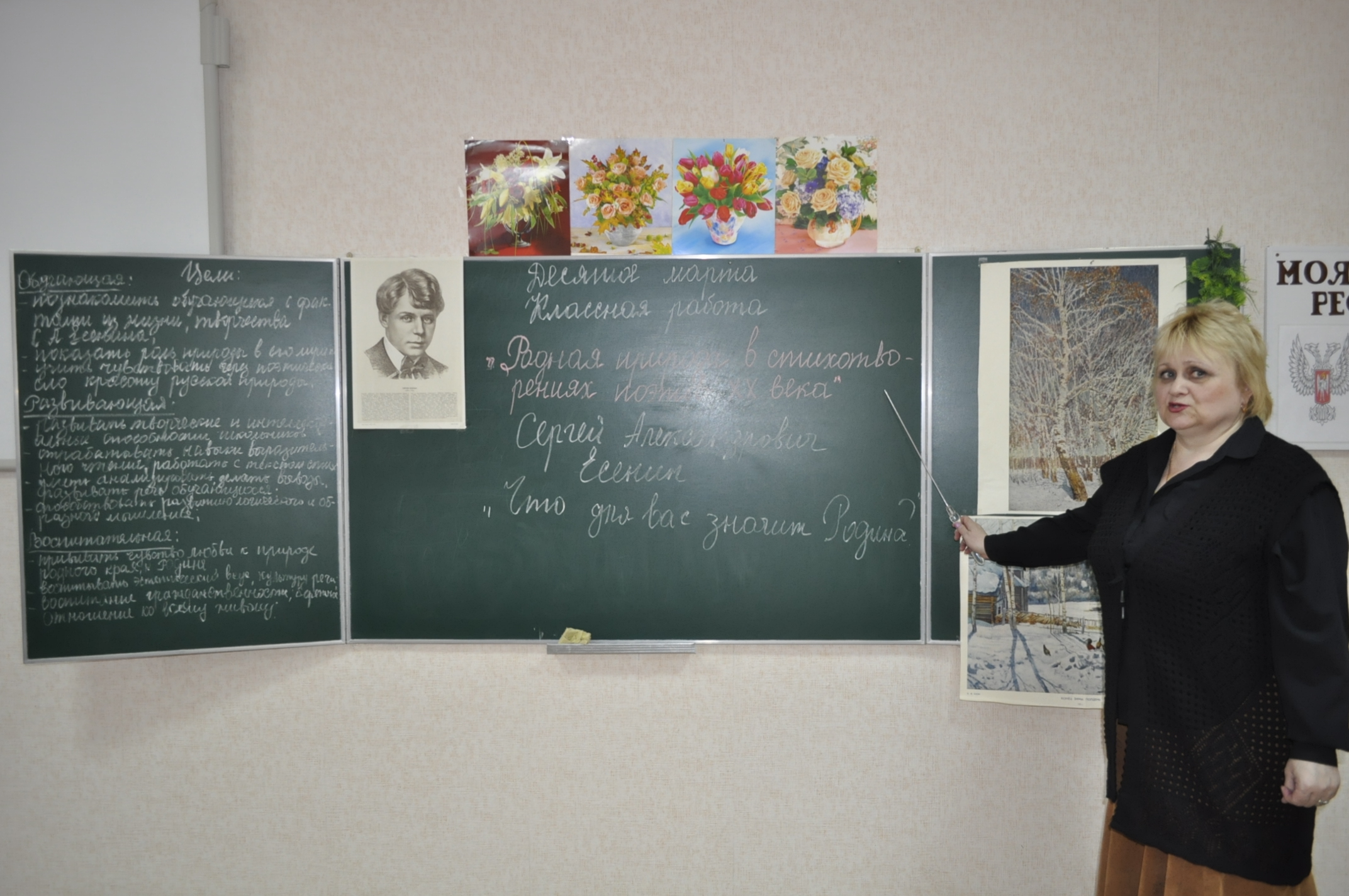 10 марта 2016 году в Амвросиевской школе – интернате №4 учителем I категории Кветкиной Ириной Борисовной был проведен открытый урок по литературе «Родная природа в стихотворениях поэтов XX века», целью которого было ознакомление обучающихся с фактами жизни и творчества А. Блока и С. Есенина, умение работать с текстом стихотворения, анализировать и делать выводы. Ребята прослушали аудиозапись стихотворения С.Есенина «Письмо матери» в исполнении артиста С. Безрукова, романс на его стихи, выразительно читали и рассказывали стихотворения наизусть, работали «поэтами», написали мини-сочинение «За что я люблю свою Родину?».